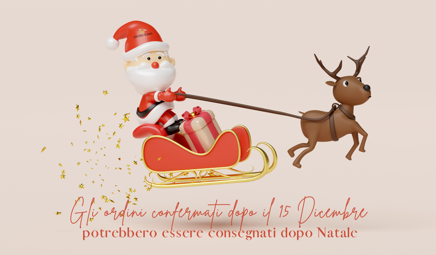 Portate un pò di pazienza, le renne del nostro corriere sono bloccate nel traffico caotico delle consegne Natalizie e per questo gli ordini confermati dopo il 15 Dicembre potrebbero essere consegnati dopo Natale.