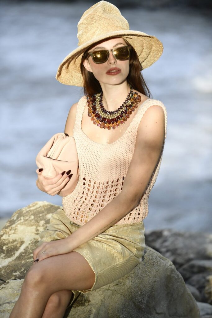 Questo top in maglia combina una lavorazione a maglia rasata nella parte superiore con un vivace gioco di trafori nella parte inferiore, creando un effetto leggero e arioso.